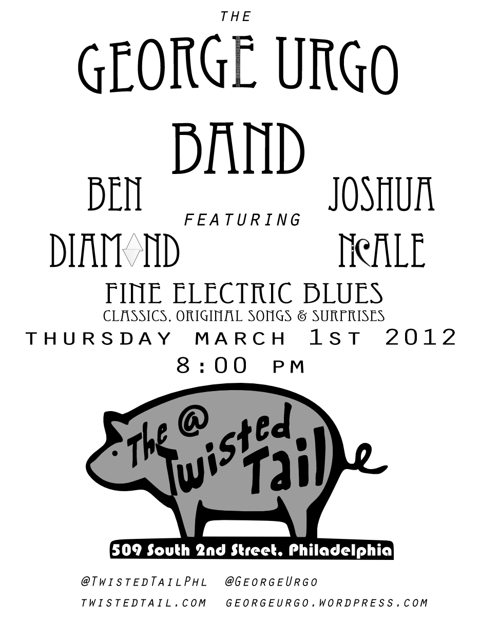 The Twisted Tail, March 1st! Posted on February 21, 2012 by George Urgo No Cover! Come hang out with us! Share this: Click to share on X (Opens in new window) X Click to share on Facebook (Opens in new window) Facebook Like Loading... Related