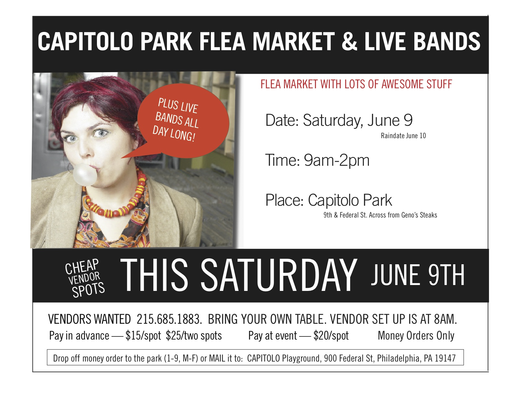 June 9th, 1:30pm – Capitolo Flea Market in Capitolo Park (9th and Federal) w/Carol Moog! Posted on June 8, 2012 by George Urgo Share this: Click to share on X (Opens in new window) X Click to share on Facebook (Opens in new window) Facebook Like Loading... Related